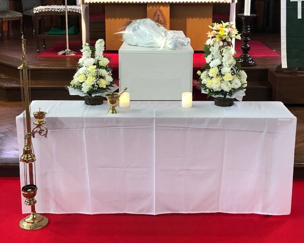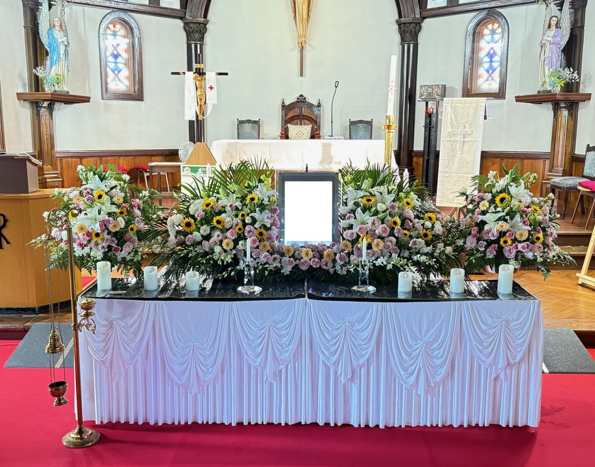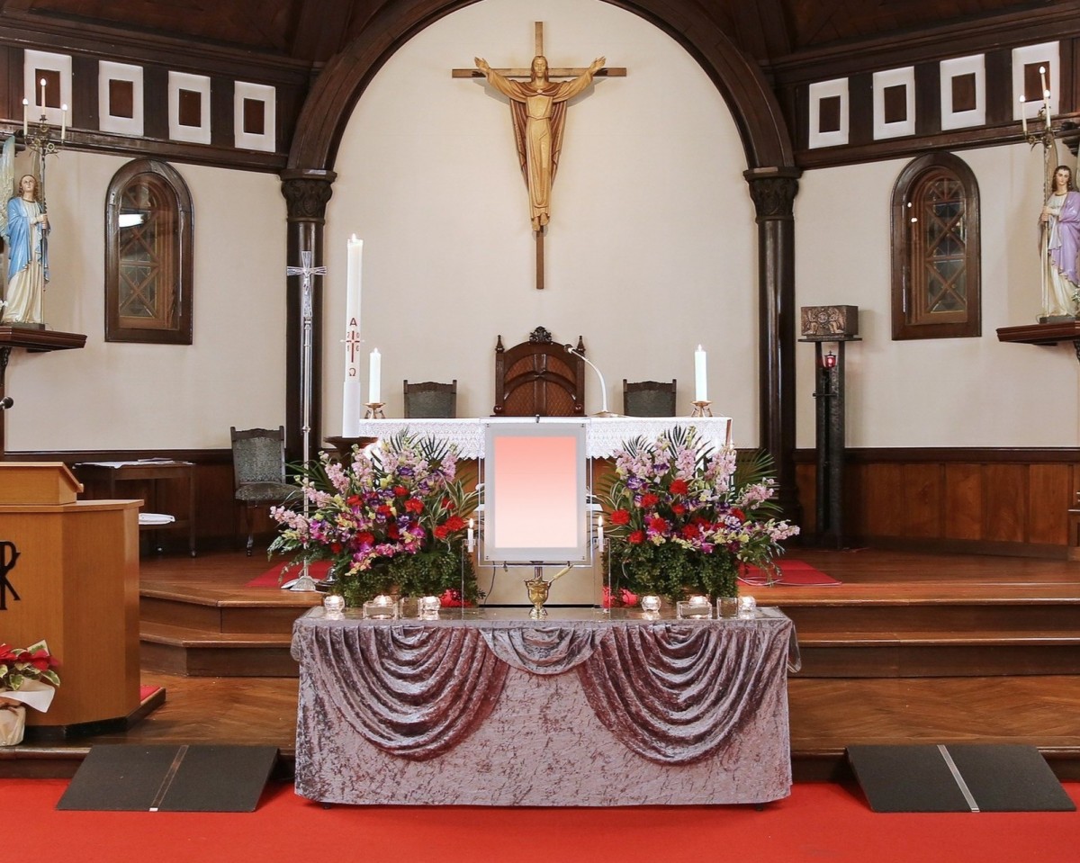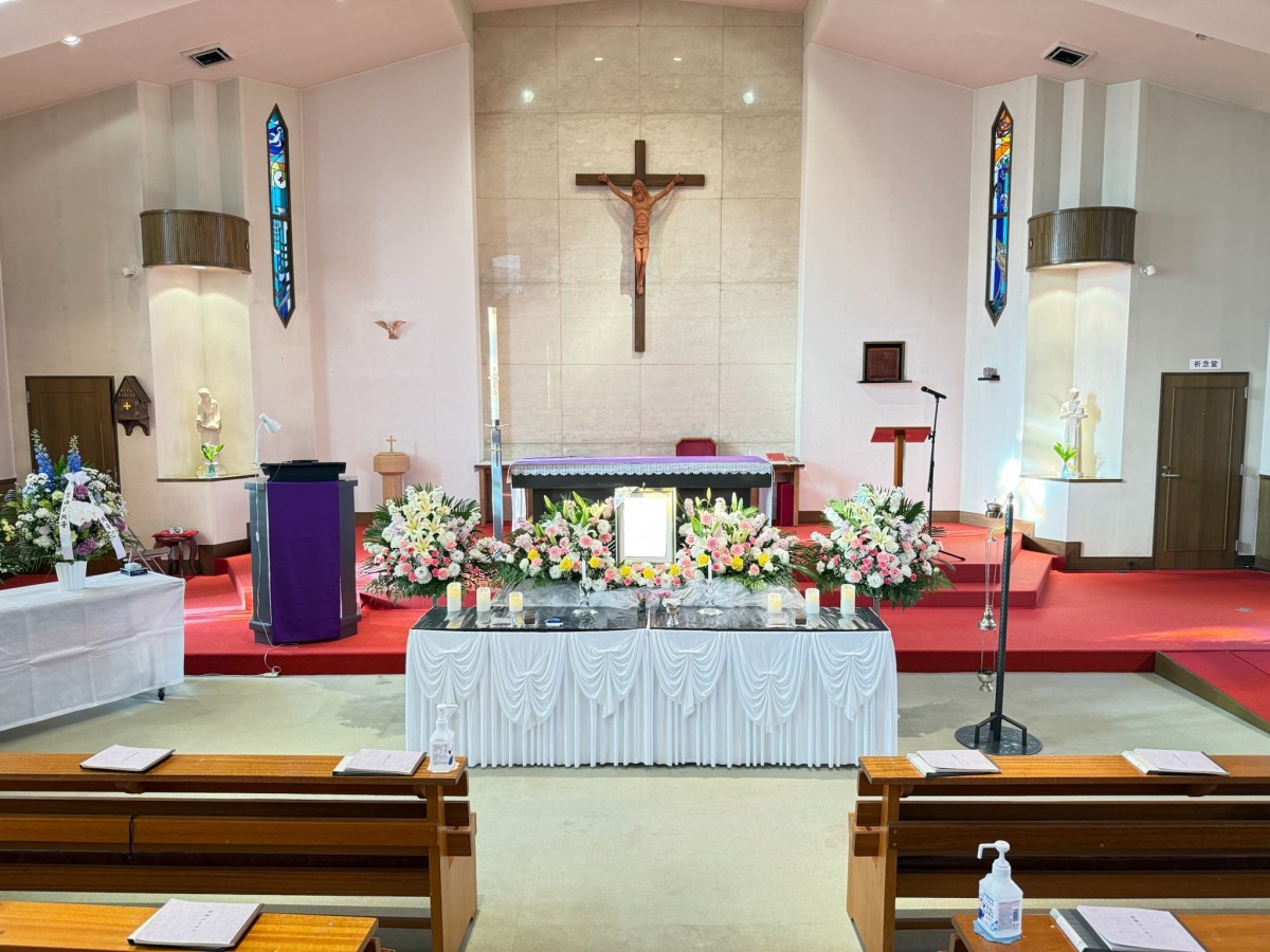- 入堂式:参列者が起立し、聖歌を歌う中、神父とご遺族、棺が入堂します。